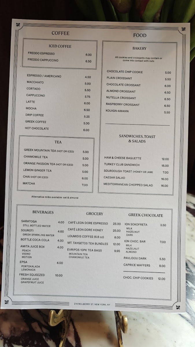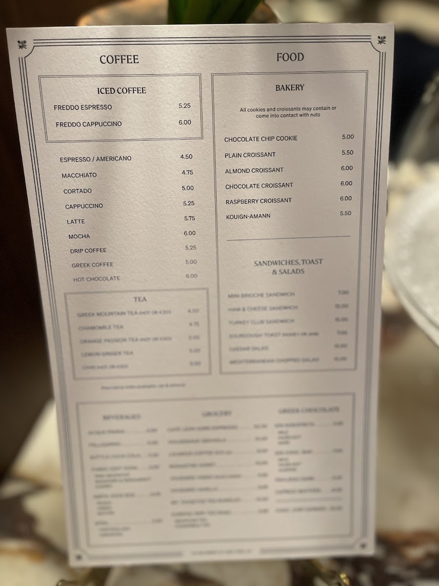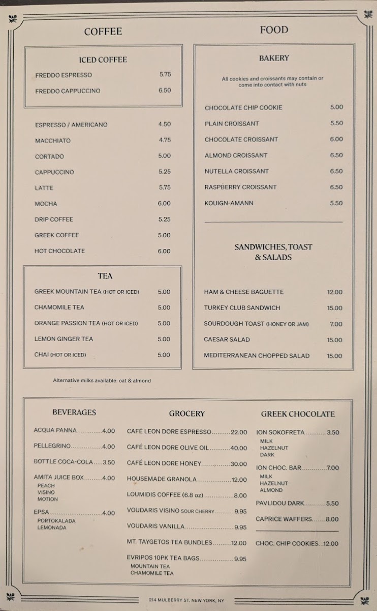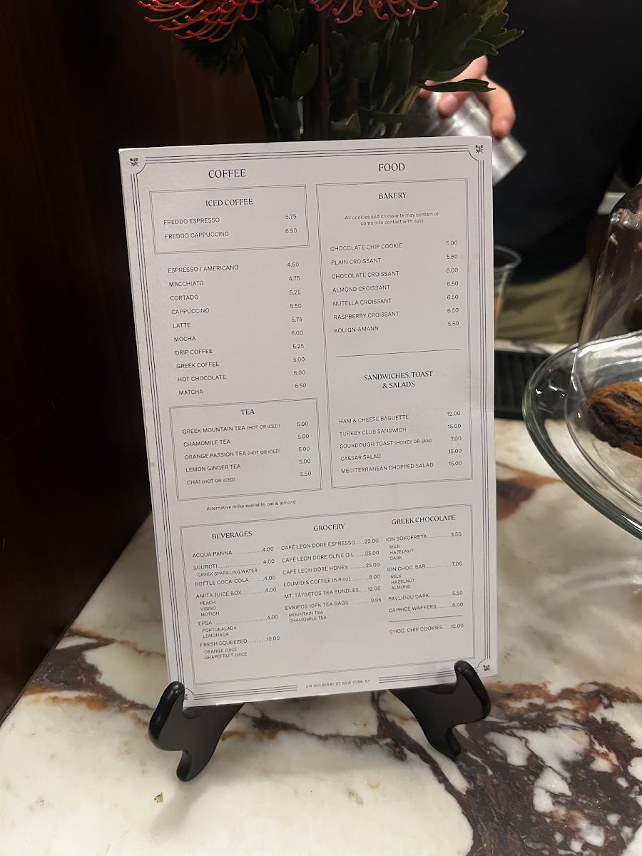 Alongside classic coffee drinks, the menu includes enjoyable treats like hazelnut croissants and choco chip cookies—items that pair effortlessly with the café’s outdoor seating and calm street atmosphere. For those looking to try something a bit different, selections of Greek tea and small sweet bites such as kourabiedes offer a subtle change of pace without straying from the approachable, comforting theme.
